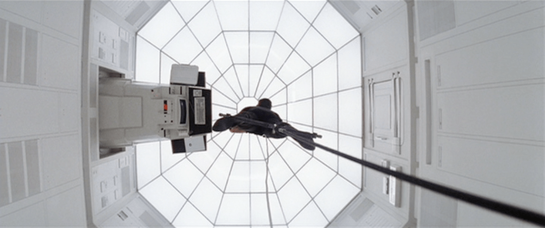 Ethan must be lowered into the vault — which bears a striking resemblance to the design of several sets in Kubrick’s 2001: A Space Odyssey — and retrieve the hard-disk files without breaking a sweat or making any noise. This becomes even more difficult since he is lowered upside-down and the room temperature must remain below 73 degrees. De Palma and his sound crew take this opportunity to engineer a sequence that unfolds in relative silence. Before entering the vault Ethan tells his team, “From here on in, absolute silence.” We then cut to a close-up of the vent grate being removed and then a close-up of Ethan being lowered down, face first. Following Ethan’s directive, we are treated to the same silence that Ethan experiences in the vault. For a moment there’s a faint hum from the computer terminal, but even this is reduced to a whisper as Ethan continues his descent.